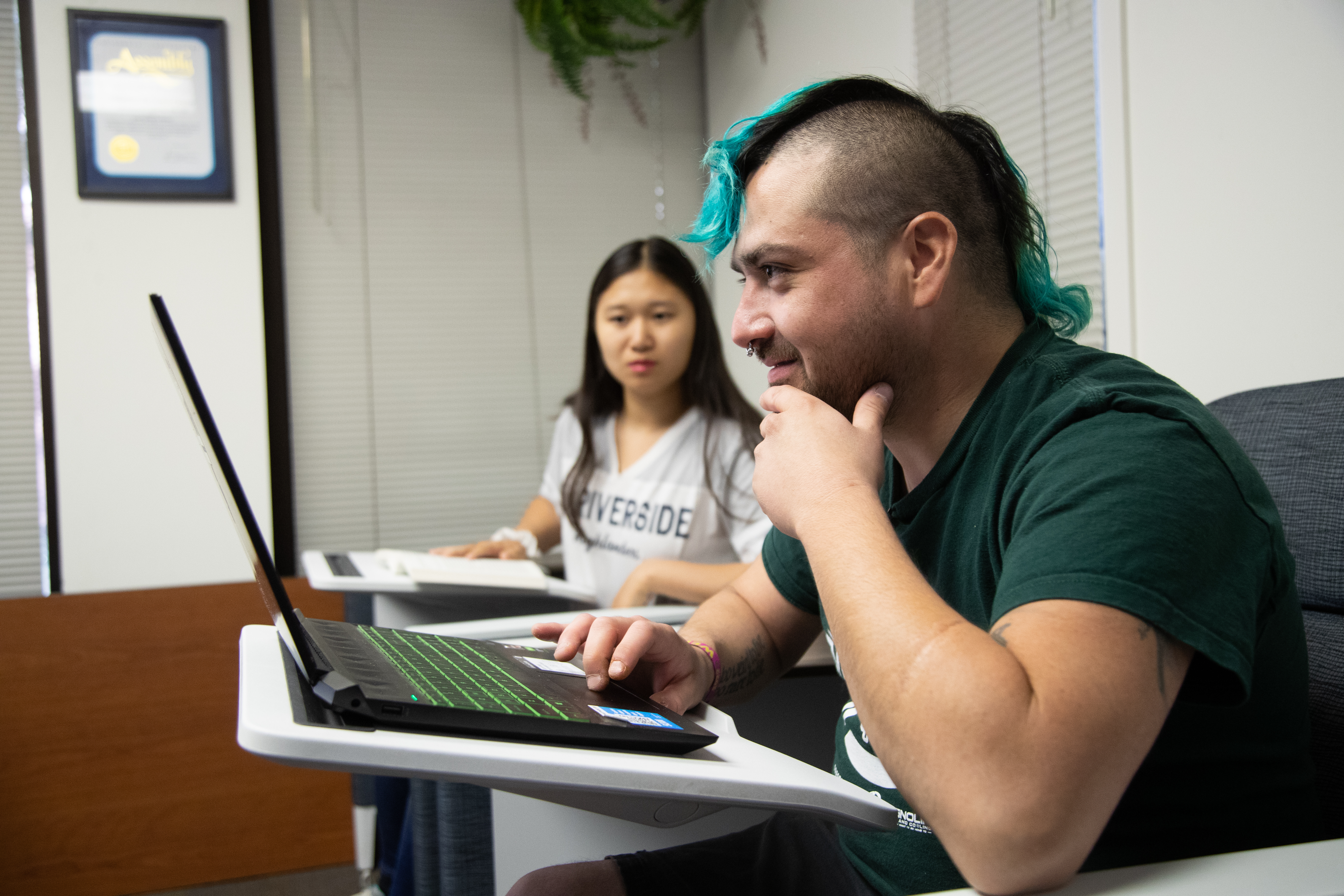 A student looks intently at their laptop screen along side a fellow student.