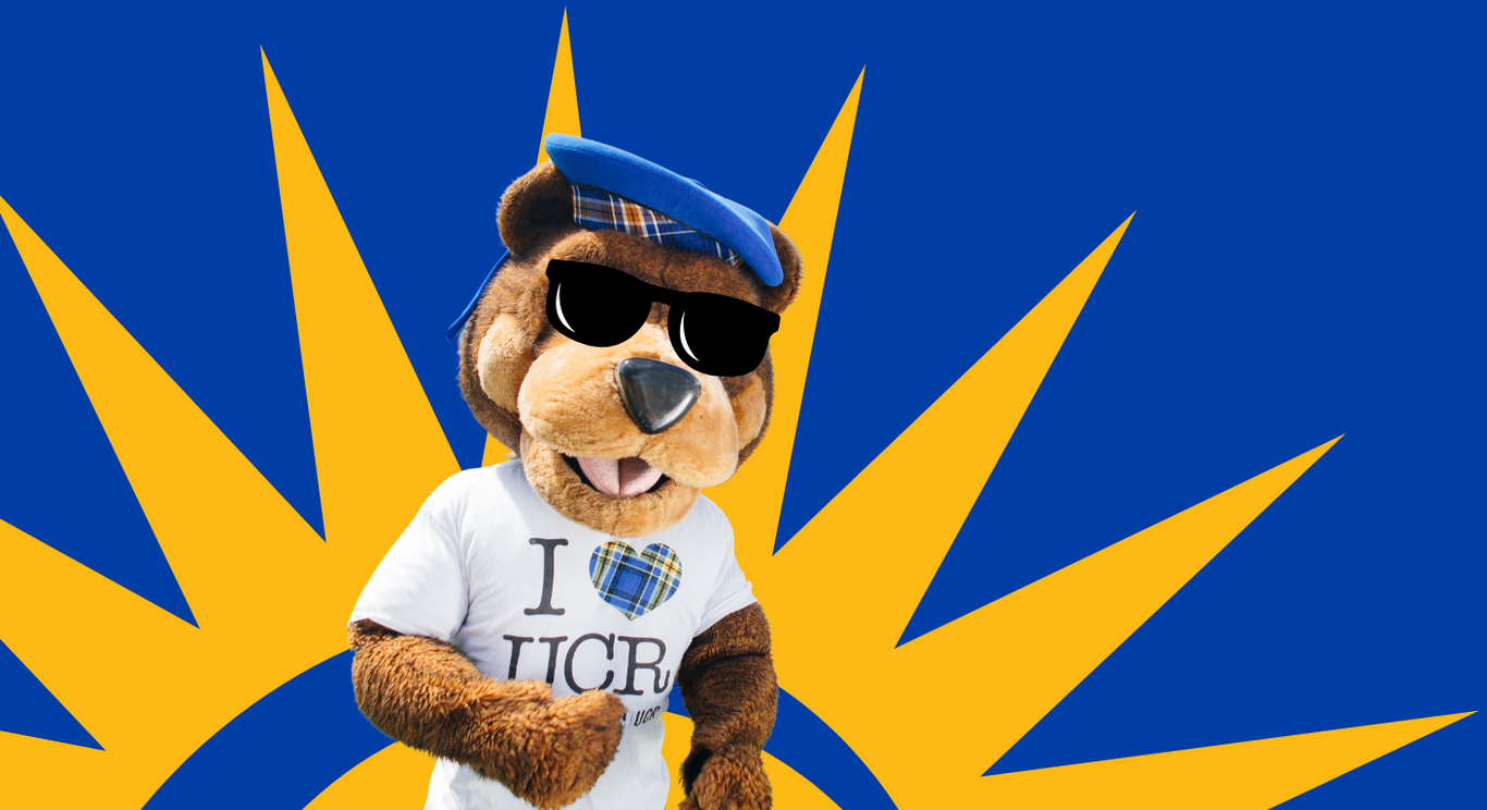 UCR's mascot Scotty wears sunglasses, a blue beret, and an I heart UCR tshirt while standing in front of an illustration of the sun